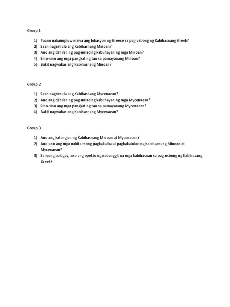 Samantalang ang mga Mycenean naman ay pangalawa at sila ang sumakop tumalo sa kabihasnang Minoan. Bakit mahalaga ang kabihasnang Mycenaean sa pagsibol ng kabihasnang Hellenic. Sa paanong paraan nagkakaiba at nagkakatulad ang kabihasnang Minoan at Mycenaean.