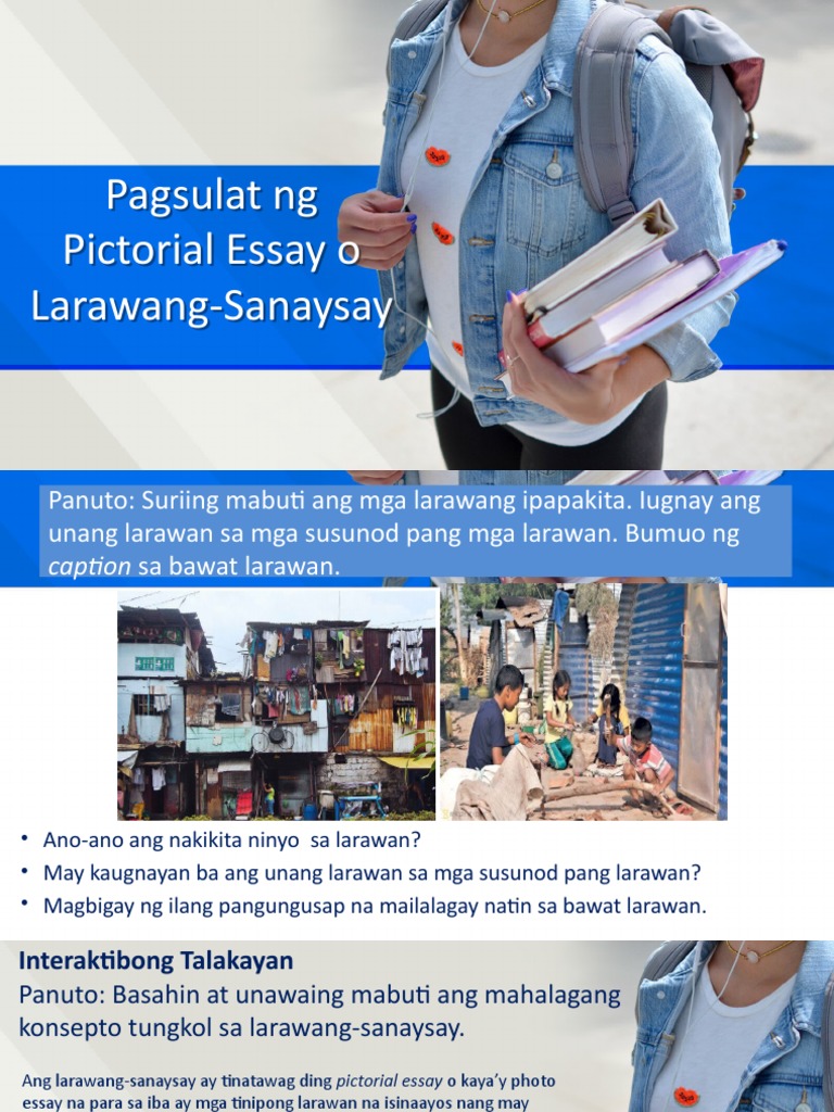 Bakit kinakailangang matutunan ang pagsulat ng pictorial essay. Paglikha ng Pictorial Essay o Larawang Sanaysay. Ang pangunahing pakay ng pagsulat ay maglarawan ng katangian anyo hugis o pangyayari batay sa nakita narinig natunghayan nararanasan at nasaksihan. January 20 2021.