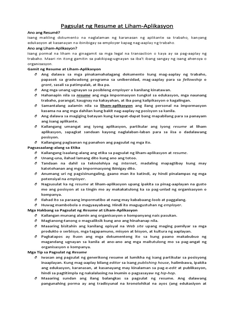 Pagkatapos kapag nasagot mo ang mga tanong na iyon armado ng impormasyong iyon maaari kang magsimulang magplano kung paano maipakita sa iyo ang kanilang mga kinakailangan sa iyong liham o sa Aplikasyon upang pumasok sa trabaho. Ano ang kanilang mg. Mga Hakbang sa Pagsulat ng Resumé at Liham-Aplikasyon Unang alamin ang organisasyon o kompanyang nais pasukan.