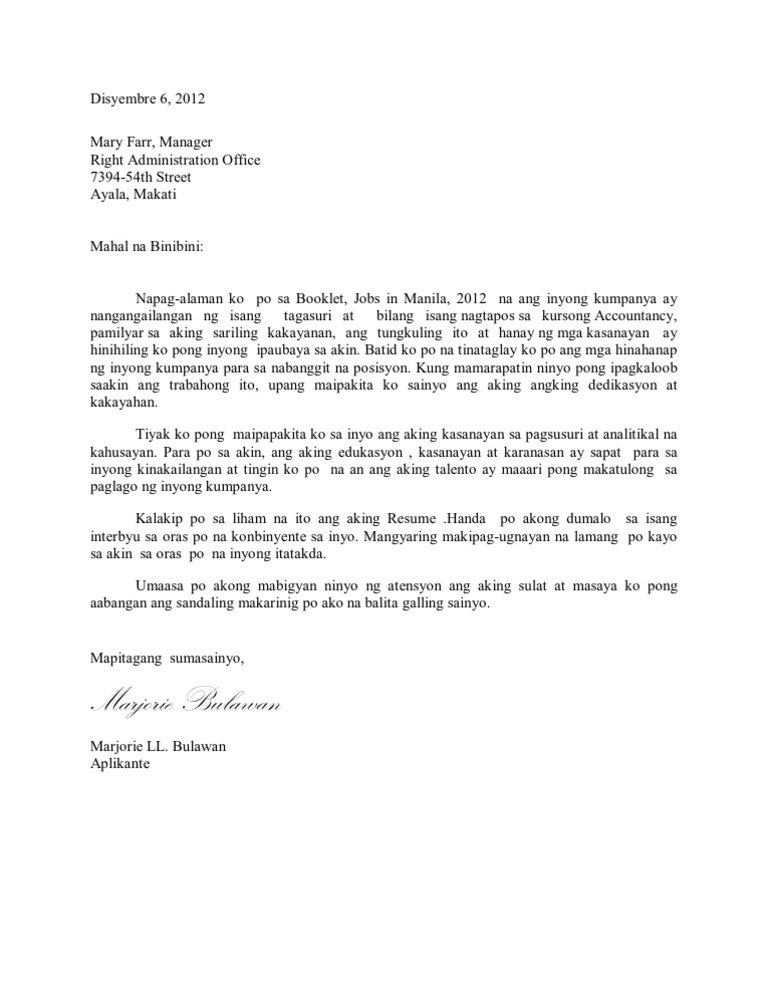 Ang isang sulat ng application ng trabaho kilala rin bilang isang cover letter ay isang liham na ipinadala mo sa iyong resume upang magbigay ng impormasyon tungkol sa iyong mga kasanayan at karanasan. Kapag nag-a-apply para sa isang trabaho ang isang liham ng aplikasyon ay isa sa pinakamahalagang dokumento na kailangan mong isulat. Lagda - Maglaan ng dalawang linyang espasyo bago ilagay ang pangalan ng taong lalagda - Kadalasang kasama rito ang panggitnang inisyal ng pangalan bagaman hindi naman laging kinakailangan.