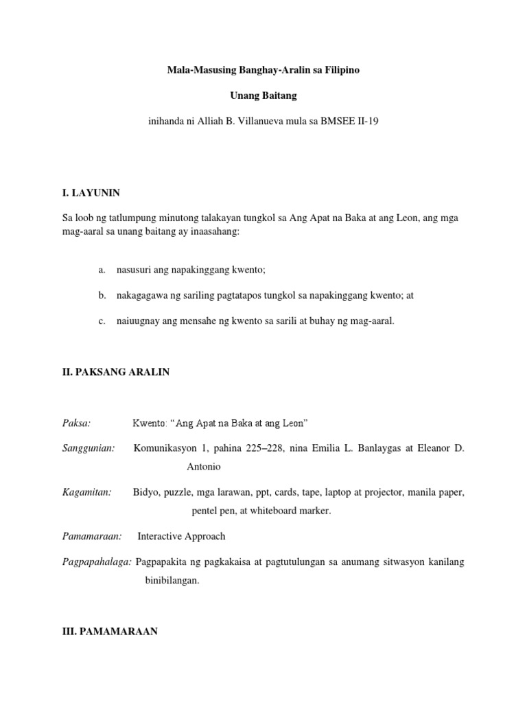 Dahil dito natatantya na ng guro bago magklase kung gaano katagal niya dapat talakayin ang. University of the Immaculate Conception College of Teacher Education Banghay Aralin sa Pagtuturo ng Filipino Assignatura.