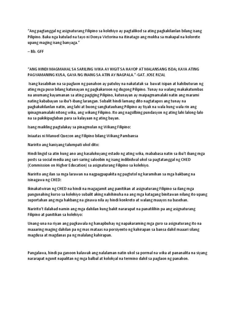 Ang Pagtanggal Ng Asignaturang Filipino Sa Kolehiyo Ay Pagtalikod Sa Ating Pagkakilanlan Bilang Isang Pilipino