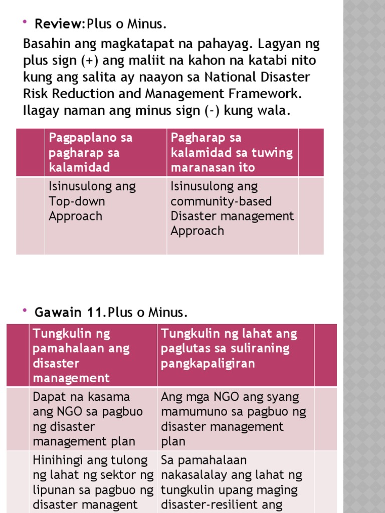 Ano ang community based disaster risk reduction management plan. Disaster Prevention and Mitigation C. 1Ano ang huling yugto ng Community-Based Disaster Risk Reduction and Management Plan. Edilberto Fajardo isang Philippine Red Cross volunteer at namamahala sa disaster risk reduction and management sa aming barangay.