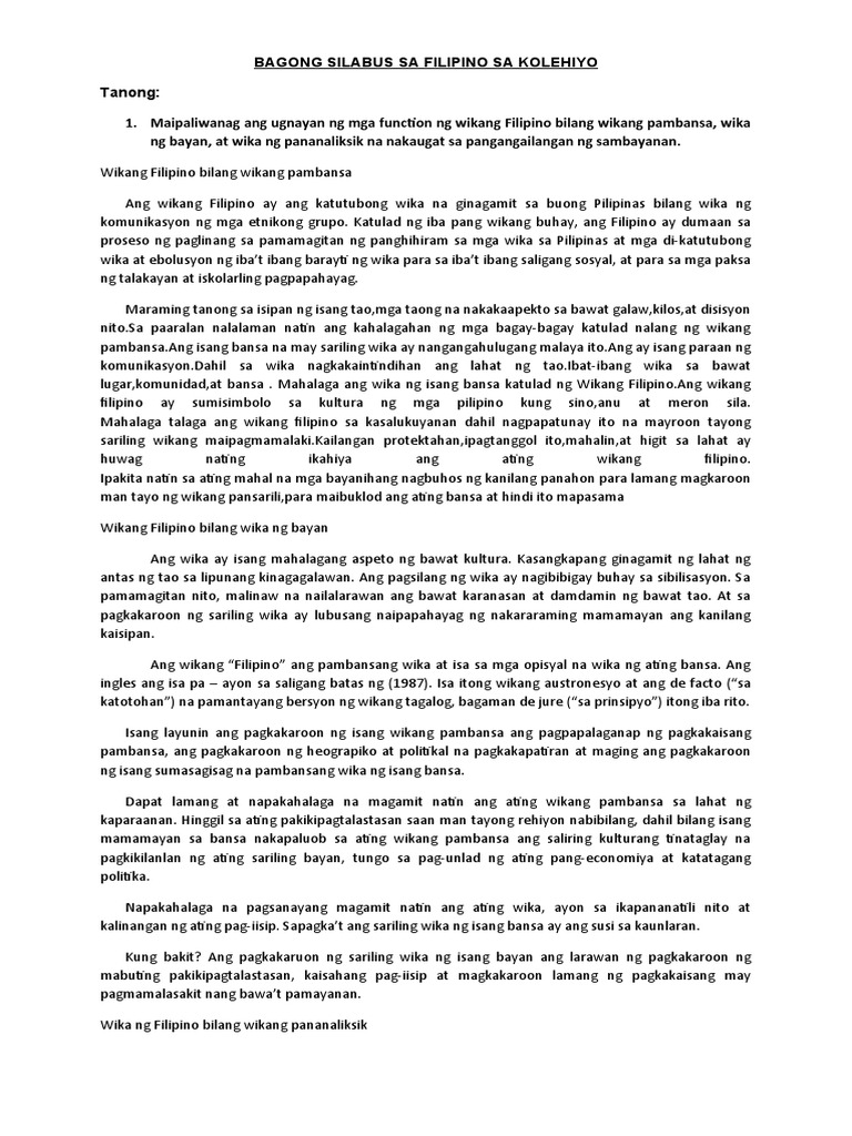 Bagong Silabus Sa Filipino Sa Kolehiyo